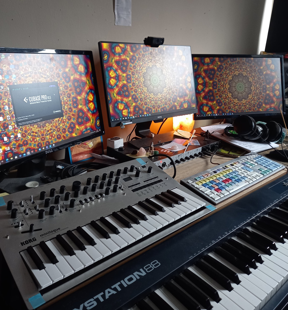 It's a work in progress. So far Ale's little home studio consists of one computer, an interface, three monitors, two speakers, a midi keyboard, a minilogue synth, a microphone (my contribution!), headphones and guitars. We also attached some soundproofing panels to the wall and installed thick courtains to seperate the room and provide further soundproofing.